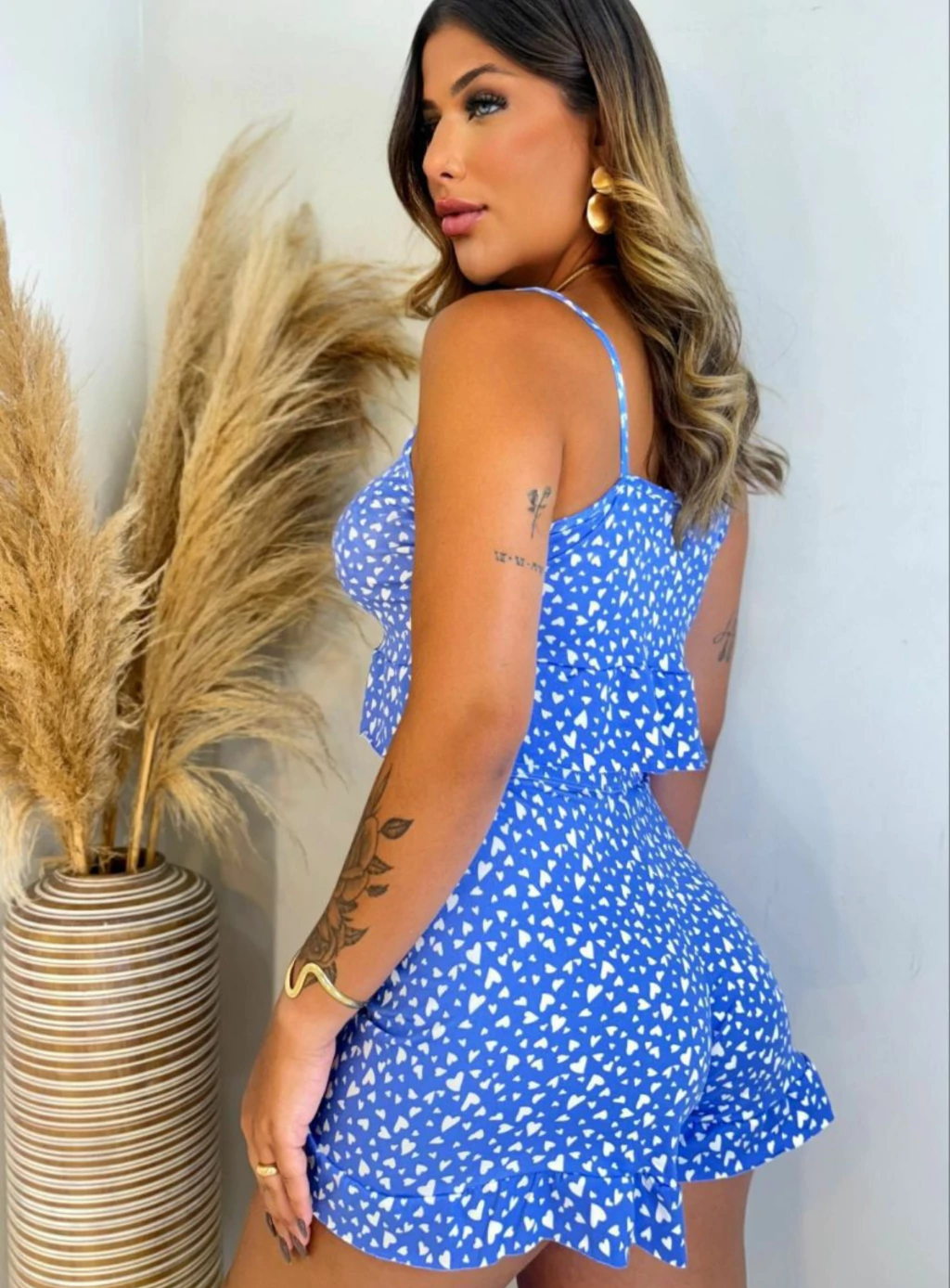 As bordas com babado conferem um toque extra de feminilidade e elegância, criando um visual encantador e delicado. O detalhe em fita de cetim no short, que permite uma amarração ajustável, adiciona sofisticação à peça, além de garantir um caimento perfeito e confortável para diferentes tipos de corpo.